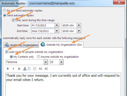 - If you choose to send replies to e-mails from non Marquette e-mail addresses, you can select My Contacts Only to avoid responding to spam.