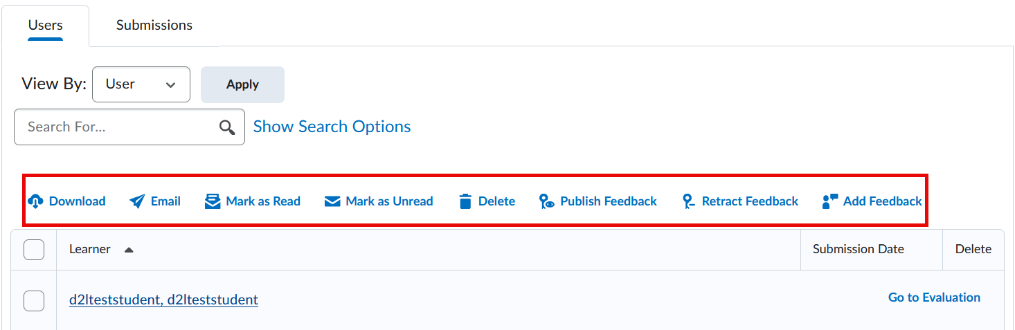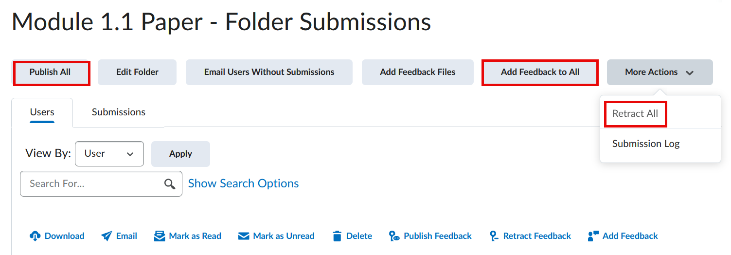 - Under Assessments > Dropbox, select the title of the dropbox folder or View Submissions under the drop-down menu.