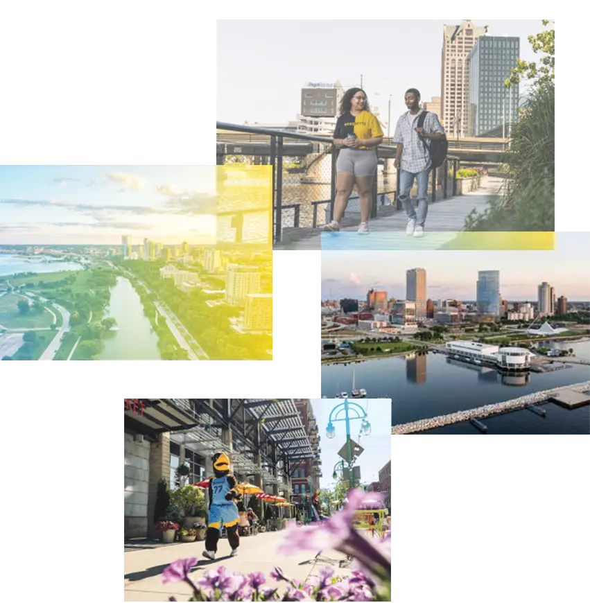 four image collage with locations around milwaukee including the milwaukee river walk, lakefront, aerial view of the oak leaf trail and the third ward