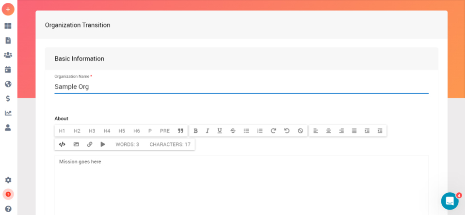 1. Log into Involve (formerly called Presence) and click on your person icon on the right corner of the page. Choose admin dashboard. The head to the organizations page or click the link in your email and skip to the final picture. Screen shot from Presence showing when to find your organization listing.