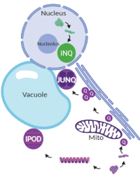 The function of these compartments is unknown, but an intriguing hypothesis is that they prevent aberrant protein interactions and facilitate clearance of protein aggregates by alternative pathways when the protein clearance machinery cannot keep up with the misfolded protein load. Misfolded protein sequestration into distinct compartments is conserved from yeast to mammals, indicating this mechanism of protein quality control is of critical importance for cell health and survival. We are currently utilizing yeast as a model system to understand the basic cell biology of protein quality control.