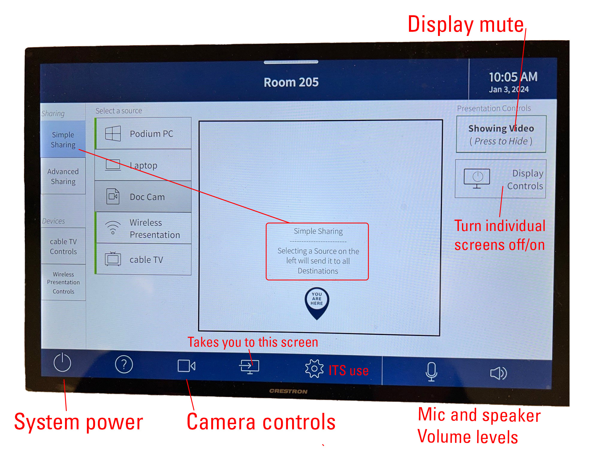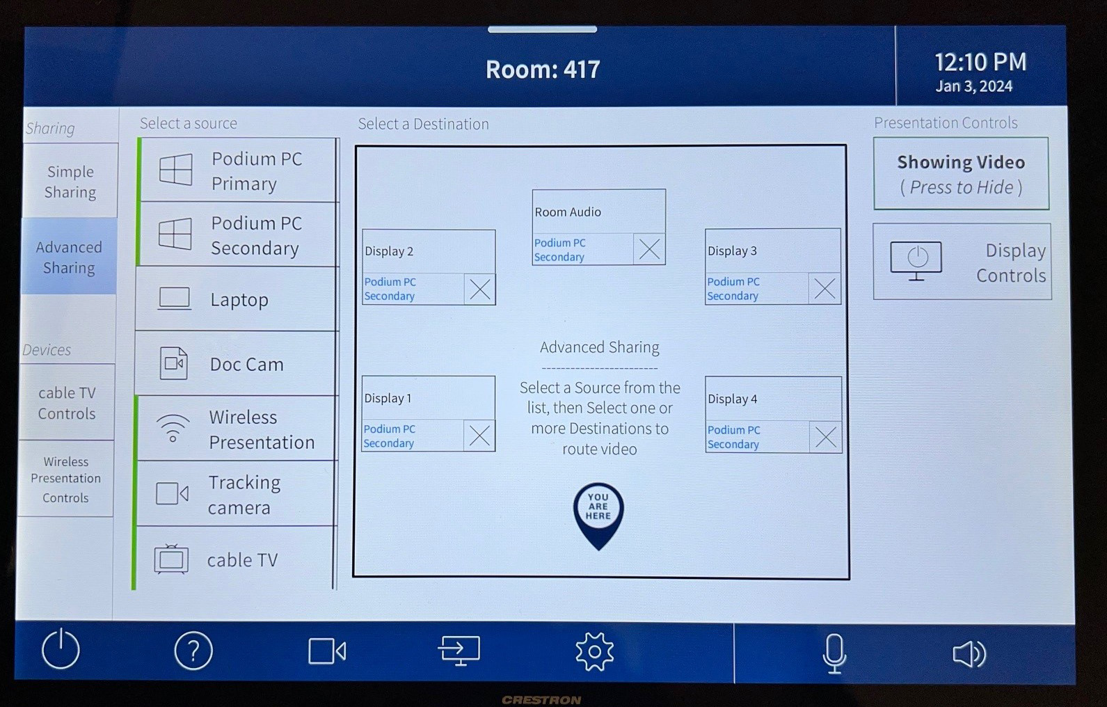 There is a cable TV feed to every classroom. You can map cable broadcasts to individual screens here as well, then use the Cable TV controls tab to select the channel.