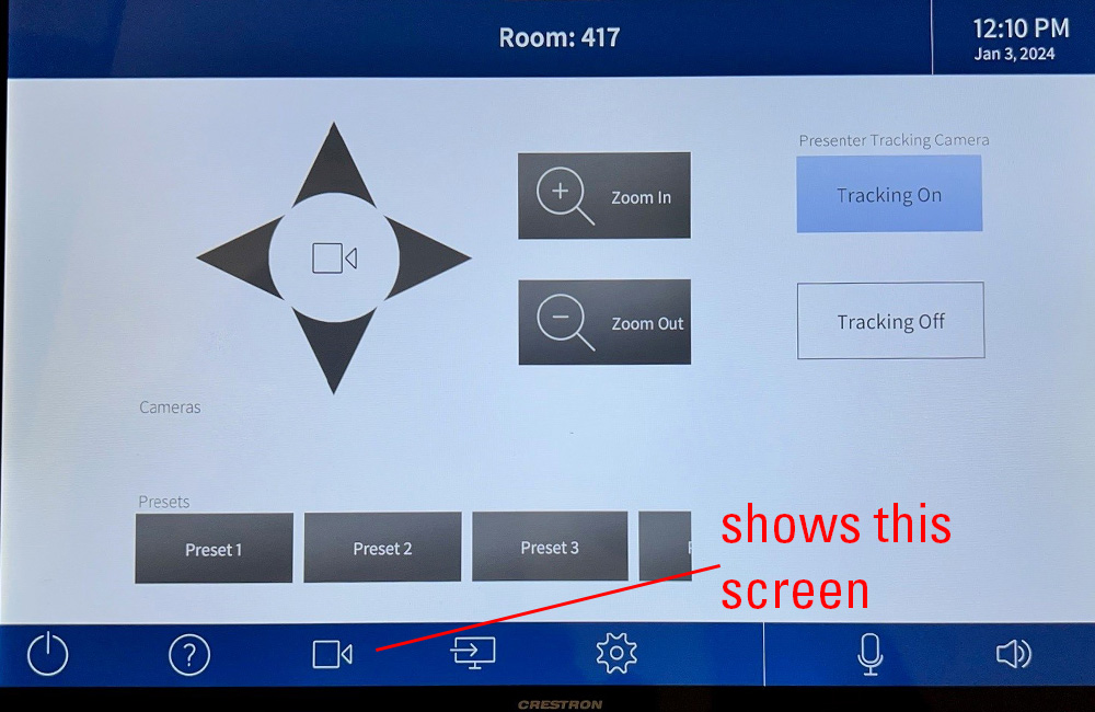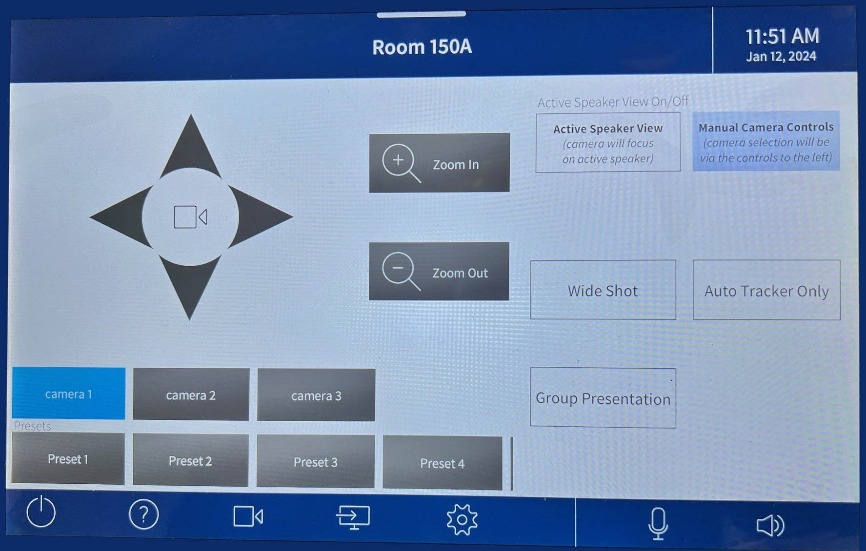 You can choose automatic presenter tracking, a preset scene, or set the camera angle and zoom manually. If you find a camera angle you like, you can save it by holding one of the open Preset # buttons for a few seconds, but be aware this may be over-written by other users.
