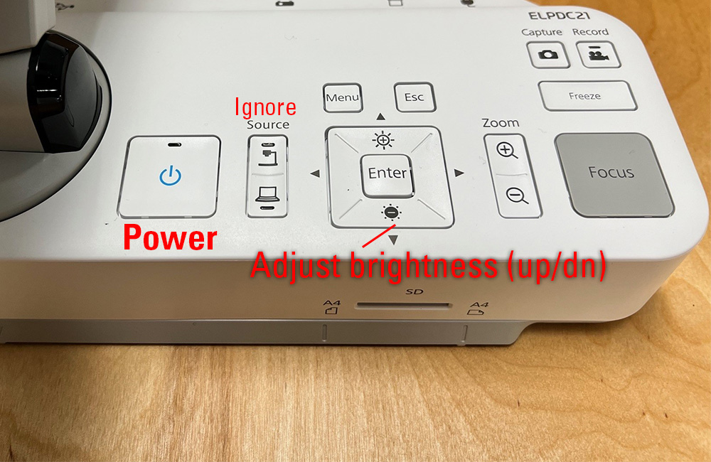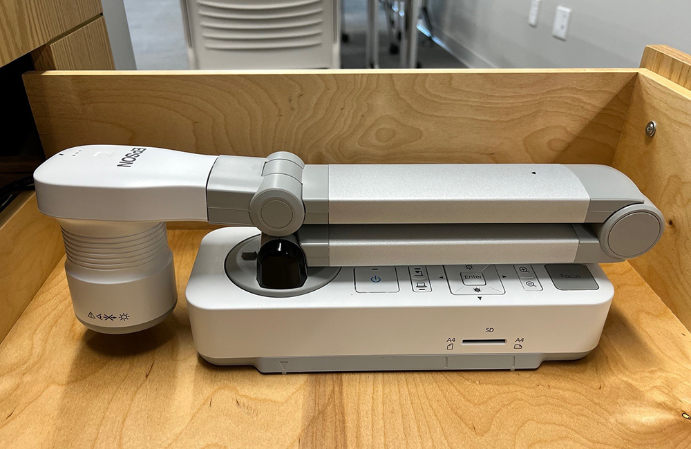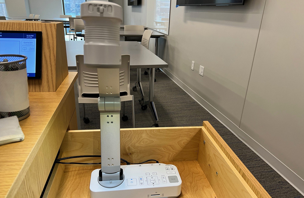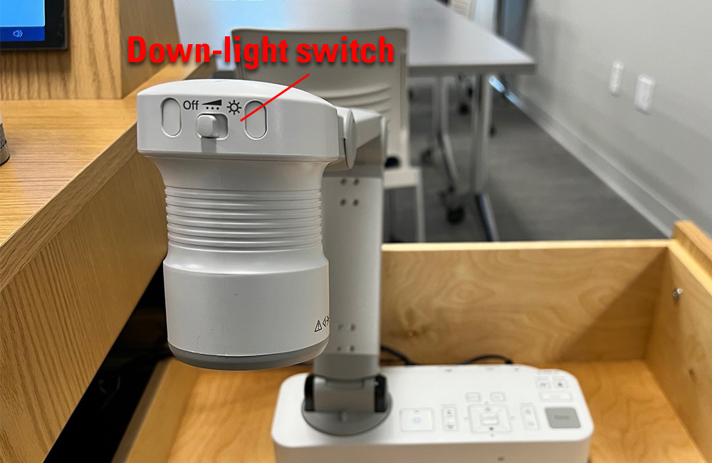The EPSON document camera is located in a drawer on the right of the podium. Use the controls on the document camera itself to turn it on or off, to zoom, or focus etc. See the document camera section below for more info.