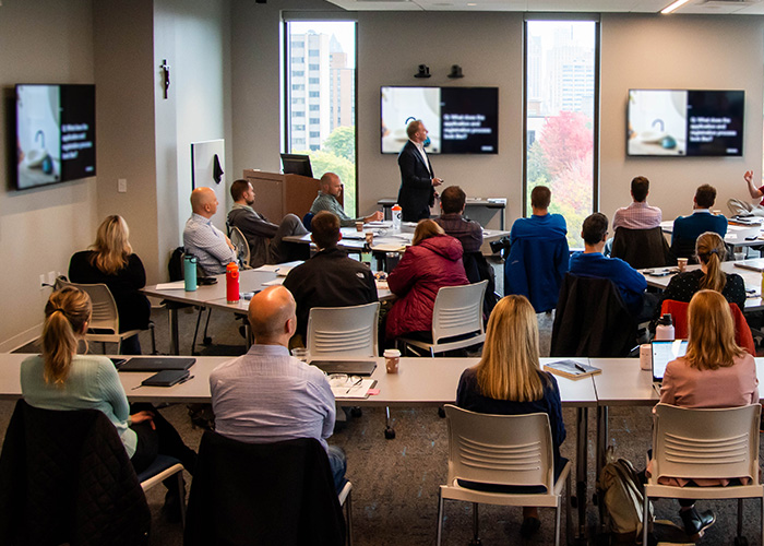 Audio is picked up automatically through ceiling-mounted microphones that are capable of hearing the entire room.