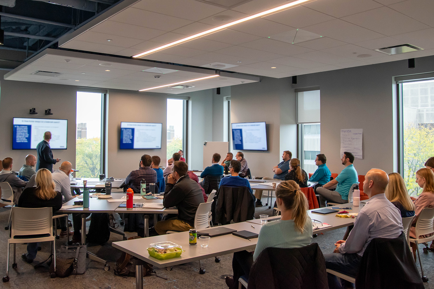 Fourth-floor, modular, multipurpose learning space that can be adapted to fit your needs.