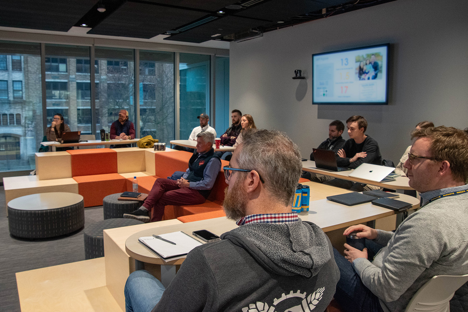 Second-floor space for presenting strategic plans or entrepreneurial ideas on a real-world stage.