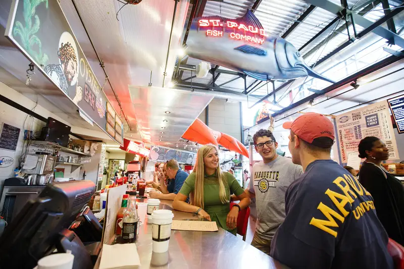 We believe food feeds the soul, so expect to have lots of moments here making friends over a meal. From full-service dining halls with various cultural dishes to convenient cafés with quick bites, Marquette keeps you nourished. We have a nutritionist on staff to help with special dietary needs and a limited-diets station. There’s also an on-campus grocery store as well as nationally renowned dining not far from campus, including USA Today's No. 1-ranked food hall, the Milwaukee Public Market (pictured above).
