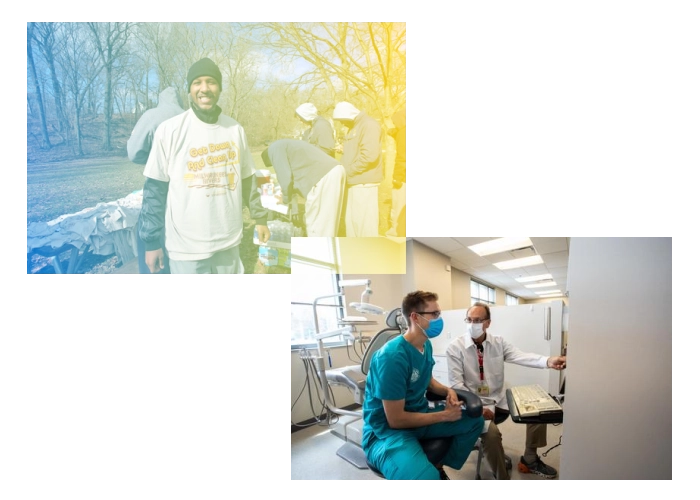two image collage - left features volunteer in park clean up, right features dentist student analyzing results on a computer