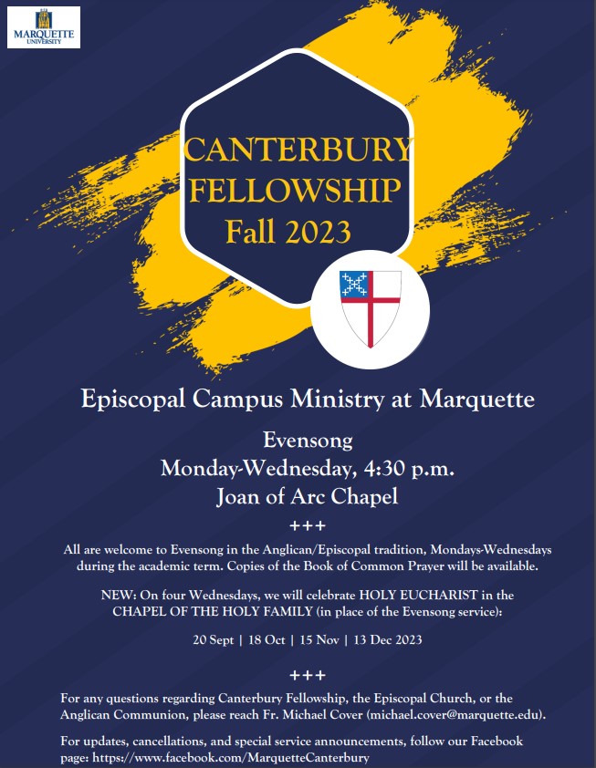 Canterbury Fellowship is Marquette’s Episcopal Campus Ministry, in full communion with the Evangelical Lutheran Church of America (ELCA), and we have three main ways you can join us on campus: