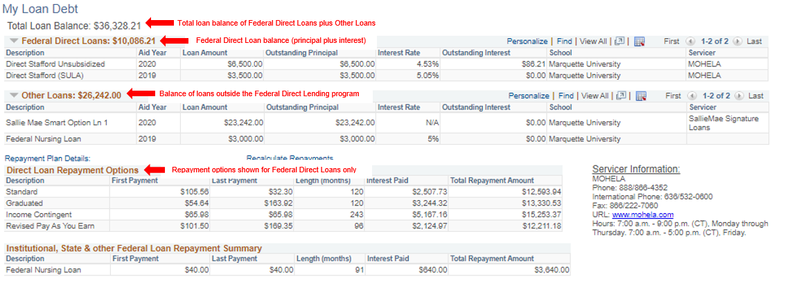 Repayment Plan Details will break down each repayment plan. This screen shows how much money is being paid toward each loan in the Federal Direct Loan program, how long the repayment will take, and how much interest will be paid on each loan. You can click or tap the ? to display information regarding each repayment plan, such as how you qualify and repayment terms.