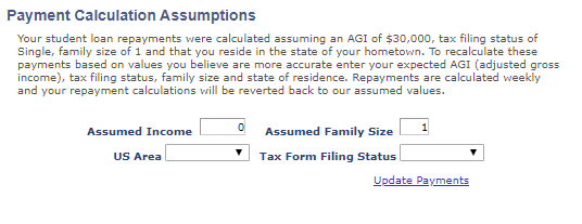 Recalculate Repayments lets you update your earnings and family situation to get a more personalized estimate of your repayment amounts under the different payment plans. Enter the information and click or tap Update Payments to see the changes.