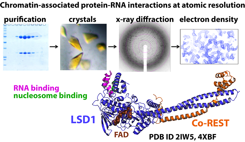 Due to LSD1’s diverse gene regulatory network, novel ways to probe LSD1 in a pathway-specific manner has high therapeutic value. We use the RNA-LSD1 network as model system to examine chromatin-associated protein - RNA interactions at atomic resolution. To this end, we seek to identify and characterize novel RNA-LSD1 interactions throughout the human genome and use this information to develop useful therapeutics that selectively target LSD1 mediated biochemical processes.