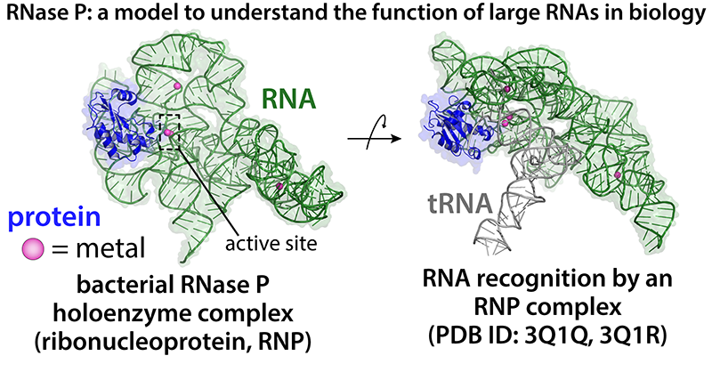 A second project in the lab is to use the RNA-protein enzyme, Ribonuclease P (RNase P), as a model to understand how large RNAs and RNA binding proteins contribute to catalysis. RNase P is required during transfer RNA (tRNA) biogenesis from bacteria to humans, and represents a nearly universal processing event that is linked to the origins of the genetic code. The discovery that the RNA component of RNase P is directly involved in catalysis demonstrated that RNA, just like proteins, is a highly versatile biomolecule and can assemble into a complex three-dimensional architecture. RNase P serves as an ideal system to explore how proteins assemble and interact with large RNA biomolecules. For this project, we integrate both biochemistry and biophysical methods, focusing on the conformational dynamics of RNase P at atomic resolution.