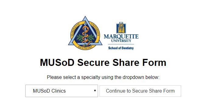 1 .From the drop-down list on the Secure Share Form, select the specific School of Dentistry Clinic to which you are sending the referral to. Click on Continue to Secure Share Form