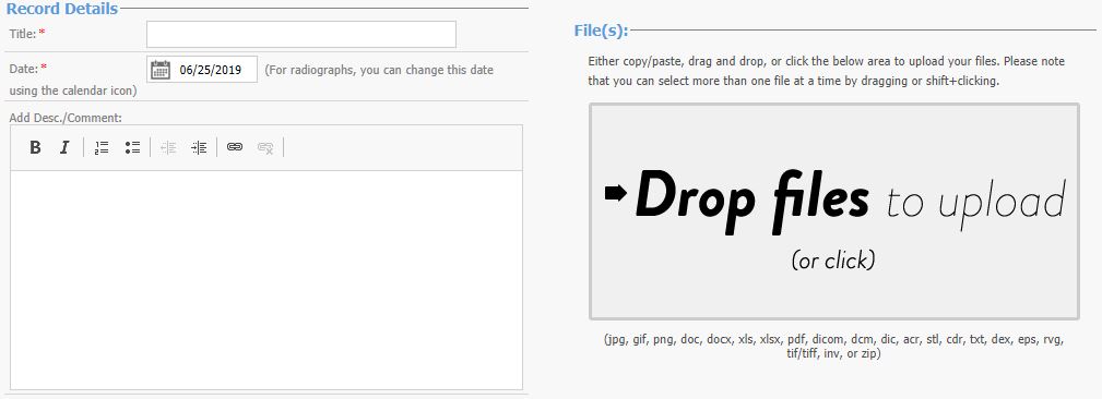 5. Fill out the Record Details including a Title, Date, a brief Description of the reason for referrals and then Select Files to upload one or multiple Radiographs and other records