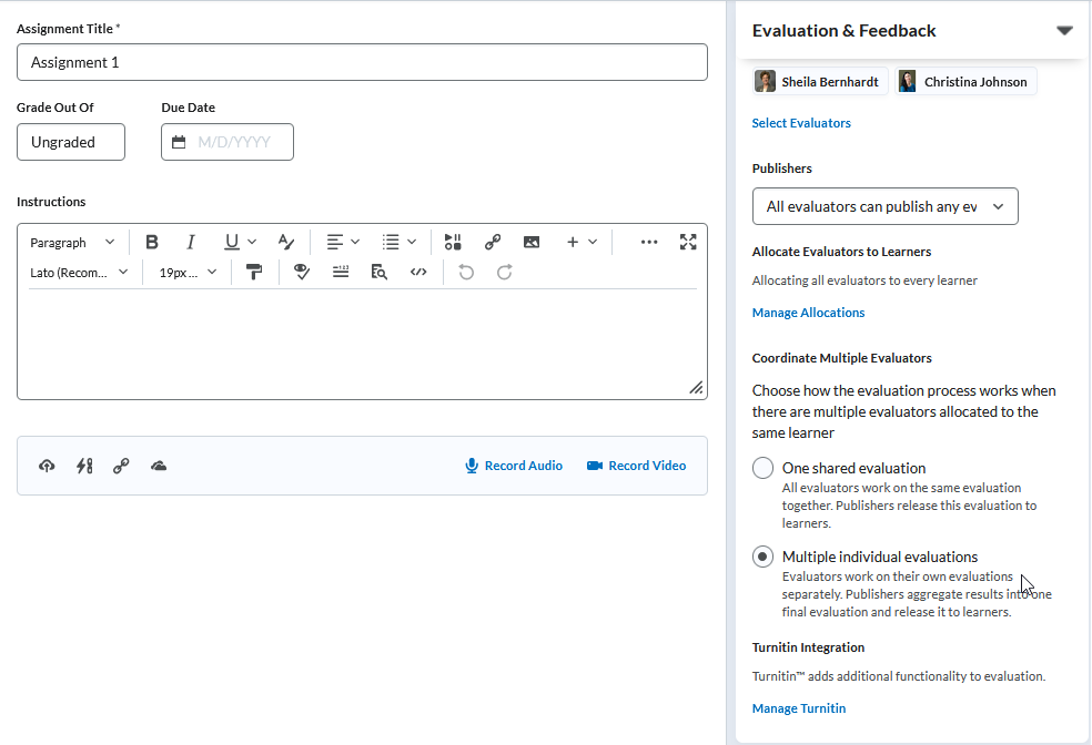 - For Coordinate Multiple Evaluators, if you would like evaluators to work on their own evaluation separately, select Multiple individual evaluations. Each evaluator can publish and retract. Publishers aggregate and release the scores into one final evaluation. Note: Once students submit to the dropbox, you will no longer have the ability to edit this selection.