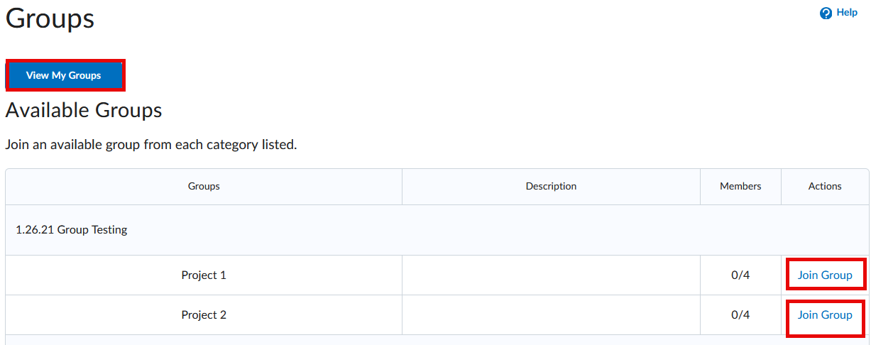 - Click the Join Group under the Actions column for the group you would like to join. Once selected, you will have been enrolled and the 'Join Group' link no longer available.
