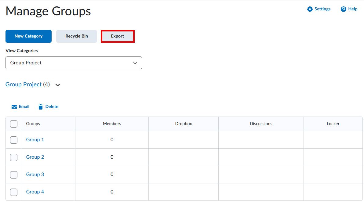 Instructors can export select or all group enrollment data to a CSV file. Report includes: