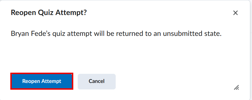 Instructors can reopen a recently submitted quiz attempt if a student accidentally submits early or experiences technical issues. Reopening the attempt allows the student to re-enter the same quiz with an updated time limit.