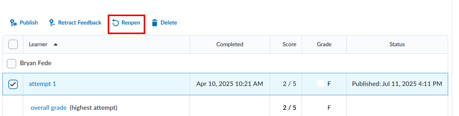 - In the list of quiz attempts, check the box(es) next to the attempt(s) you would like to reopen.