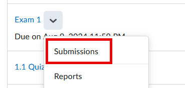 - Select Submissions from the dropdown menu of the name of the quiz or exam.
