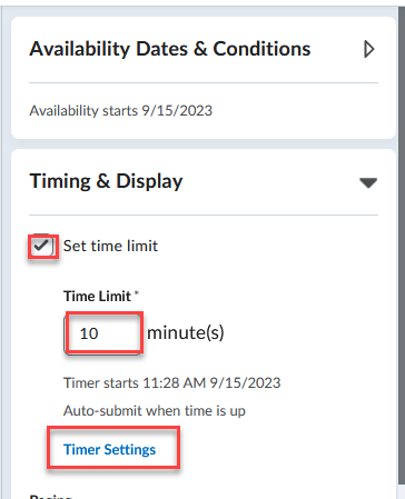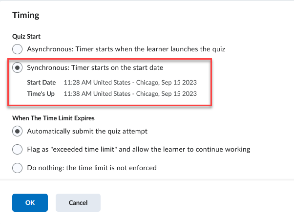 - Note: If you are creating a Synchronous Quiz or Exam, you would need to change the default setting from Asynchronous to Synchronous in Timing & Display. Be sure to enter a Start Date in the Availability Dates & Conditions panel.