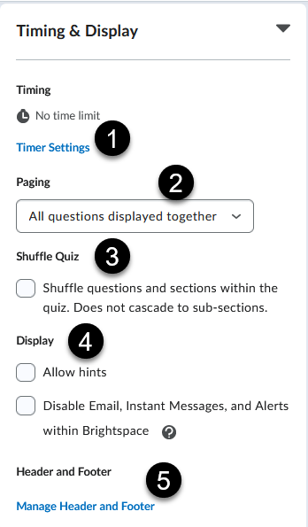 - Display provides an option to allow hints on the quiz or exam. Check to disable email, instant messages, and alerts within D2L.