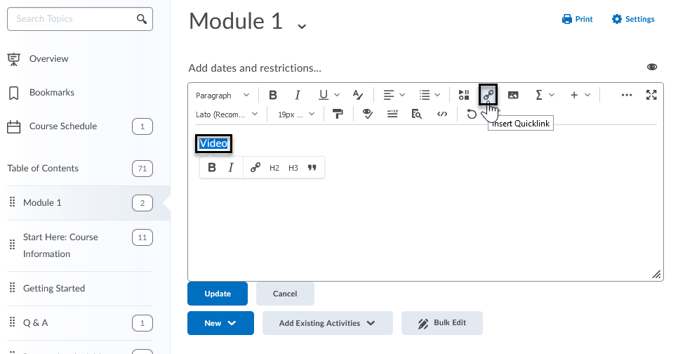 - Enter text and highlight the word to be used as the hyperlink for the video. Use the Insert Quicklink (chain icon) from the toolbar to select URL.