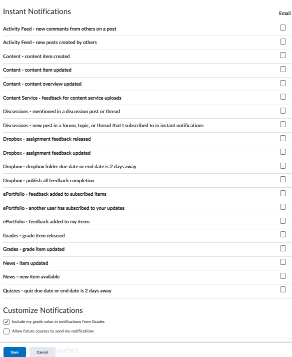 Notifications allows you to control how you receive notifications about activities in your course. You can choose to receive instant notification via your preferred method (email or SMS) or you can choose to receive a summary of activity daily for each of your courses through email.