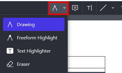 - Drawing/Highlighter (freeform and text) and Eraser are located under the Marker icon.