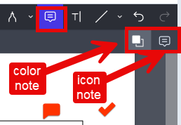 Colored comments (sticky notes), right pointer, comment with checkmark, comment with circle (ellipse), comment with x (cross), comment with insert text, comment with new paragraph left pointer, comment with text note, comment with paragraph, comment with question mark (help), comment with star, comment with key are located under the Note icon.