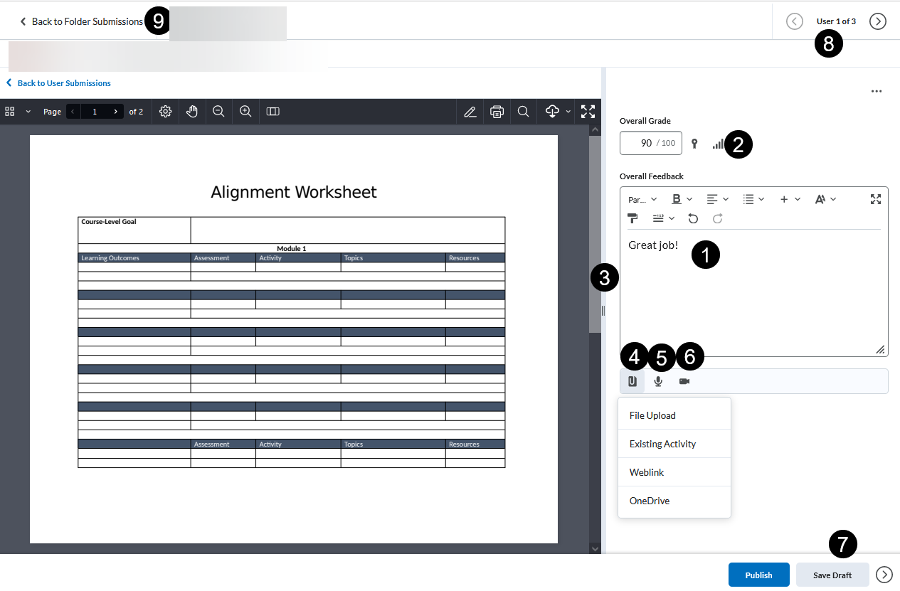 - Provide feedback [1] and score [2]. Use the draggable divider to resize your panels [3]. Upload file [4]. Record audio [5]. Record video [6]. Save draft [7] and continue to grade each student [8]. Click Back to Folder Submissions [9].
