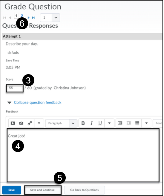 - Enter the score [3] and feedback [4]. Click Save and Continue [5]. Select the next student by clicking the number or arrow [6].