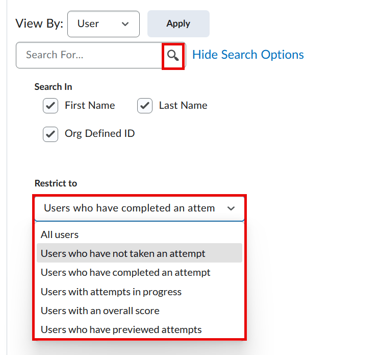 - From the quiz attempt list page, you can filter submissions by student, attempts or questions.