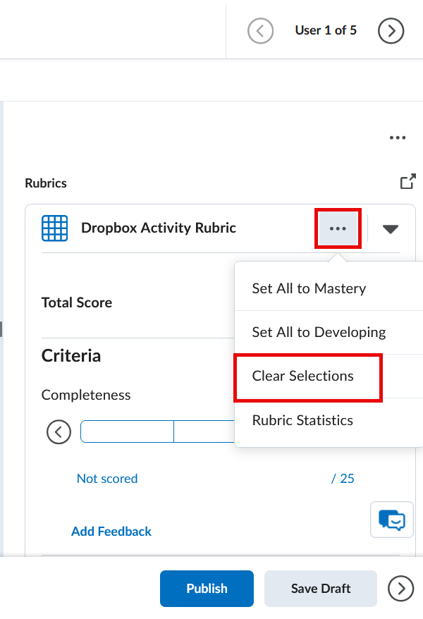 - Select Clear Selections found in the ellipsis to the right of the rubric name.