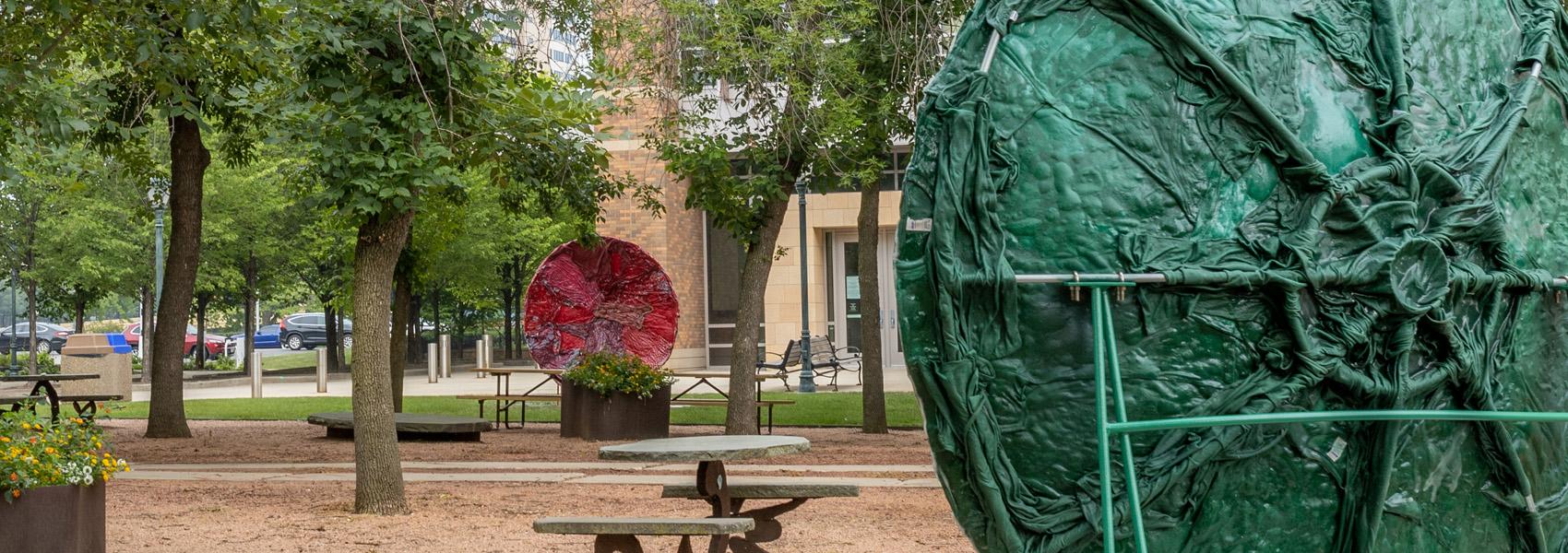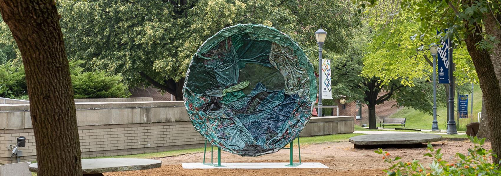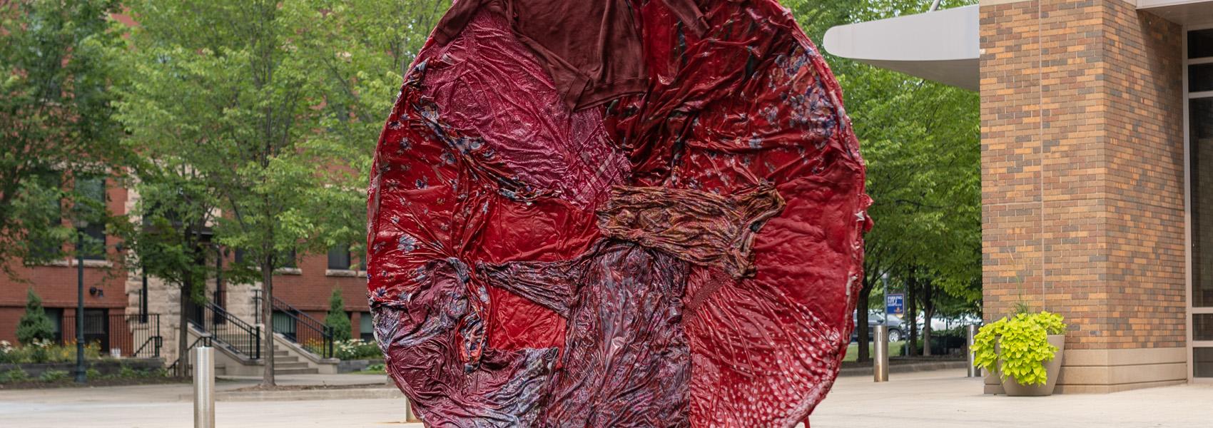 The Haggerty Museum of Art is pleased to serve as one of the sites hosting a sculpture installed by Sculpture Milwaukee. Kevin Beasley's Who's Afraid to Listen to Red, Black and Green? is now installed in and around the sculpture garden located north of the Haggerty's building. Kevin Beasley works across a variety of media including sculpture, installation, sound, and video. The material aspects of his practice are rooted in the use of found objects (most often clothing) that convey intimate personal and cultural histories, and in highly process-oriented, malleable materials including resin and polyurethane. Who’s Afraid to Listen to Red, Black, and Green,? a trio of acoustic mirrors in the iconic colors of the African-American flag, transforms the space it inhabits, redefining its social purpose by providing opportunities for its audience to have an active relationship to space, sound, and the presence of the physical body of the viewer. Go to Sculpture Milwaukee's web site for complete information about this remarkable urban public art exhibition, now in its fifth year. Photo credits: Brian Pfister, Sculpture Milwaukee.