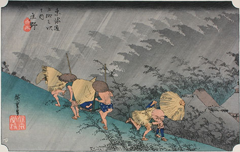 Utagawa Hiroshige (Japanese, 1797 – 1858), Driving Rain at Shuno (no. 46) from Fifty Three Stations of the Tokaido Road. Woodblock print, 9 5/8 x 15 in (24.4 x 38.1 cm). Gift of Mr. Samuel Gansheroff, Collection of the Haggerty Museum of Art, Marquette University, 83.14.9.