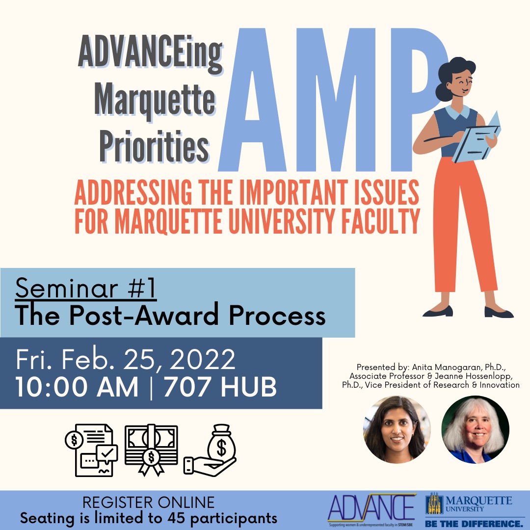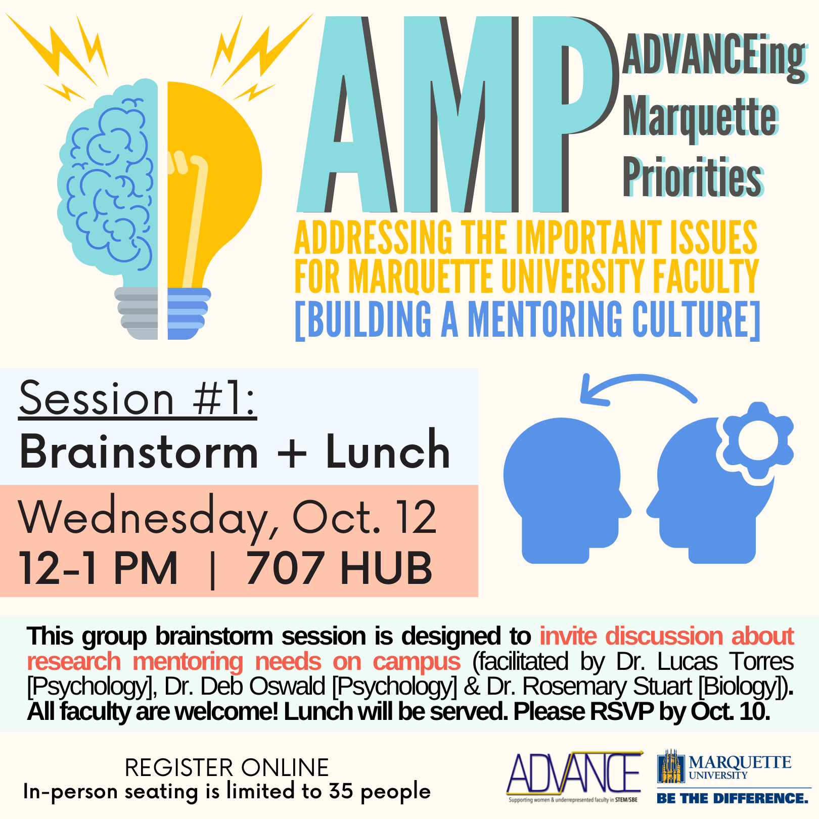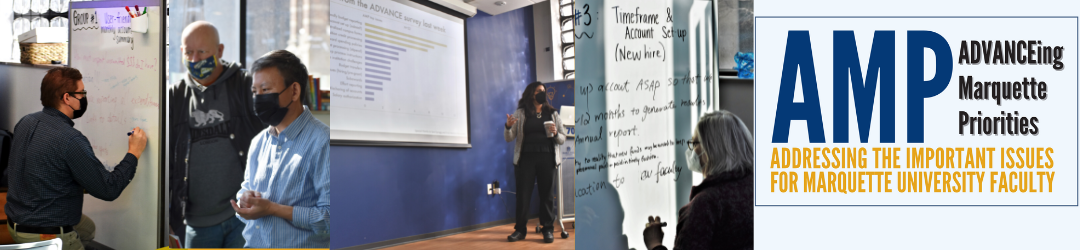 is a new initiative (as of January 2022) through the ADVANCE program, specifically at Marquette University. AMP is designed to develop and implement solutions to faculty-identified priority challenges via workshops or other interactive mechanisms that bring together faculty and staff. Contact Dr. Jeanne Hossenlopp or Sara Spragg if you'd like to lead a future AMP topic.