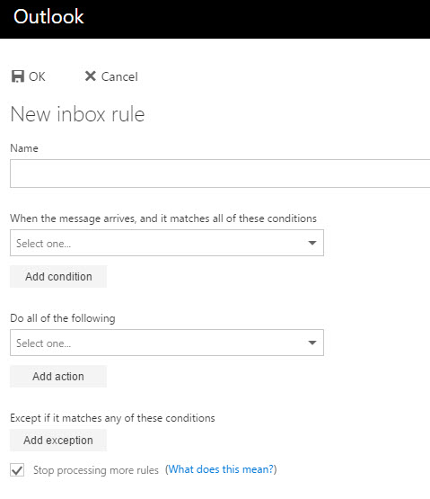 - Click or tap Inbox Rules, name the rule, make your selections and save the changes.