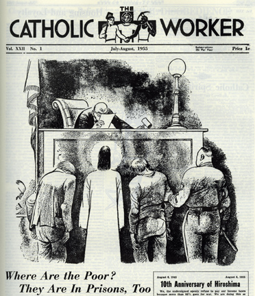The Catholic Worker used its front page to cover the protests, including this July-August 1955 issue, which contained Dorothy Day's article on the demonstration and a telling illustration by Quaker artist Fritz Eichenberg, a frequent contributor to the newspaper.