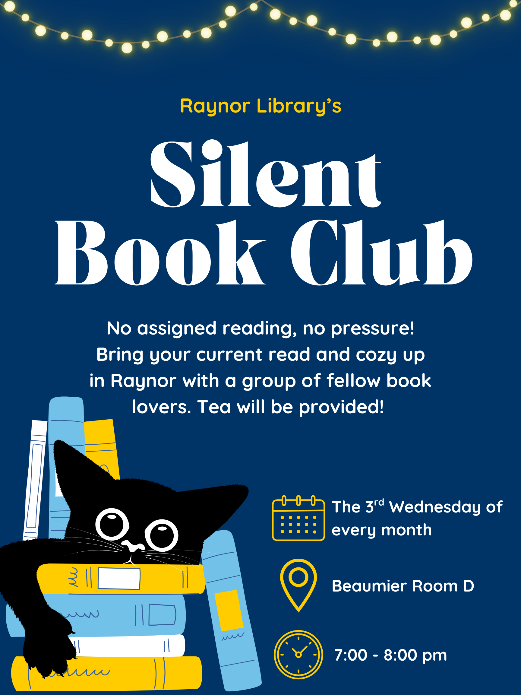 Silent Book Club events will be held in Beaumier D, Raynor Lower Level, 7:00 to 8:00 p.m., on these dates: