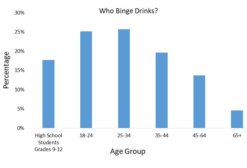 Binge drinking is most common among younger adults aged 18–34 years. Binge drinking is twice as common among men than among women.