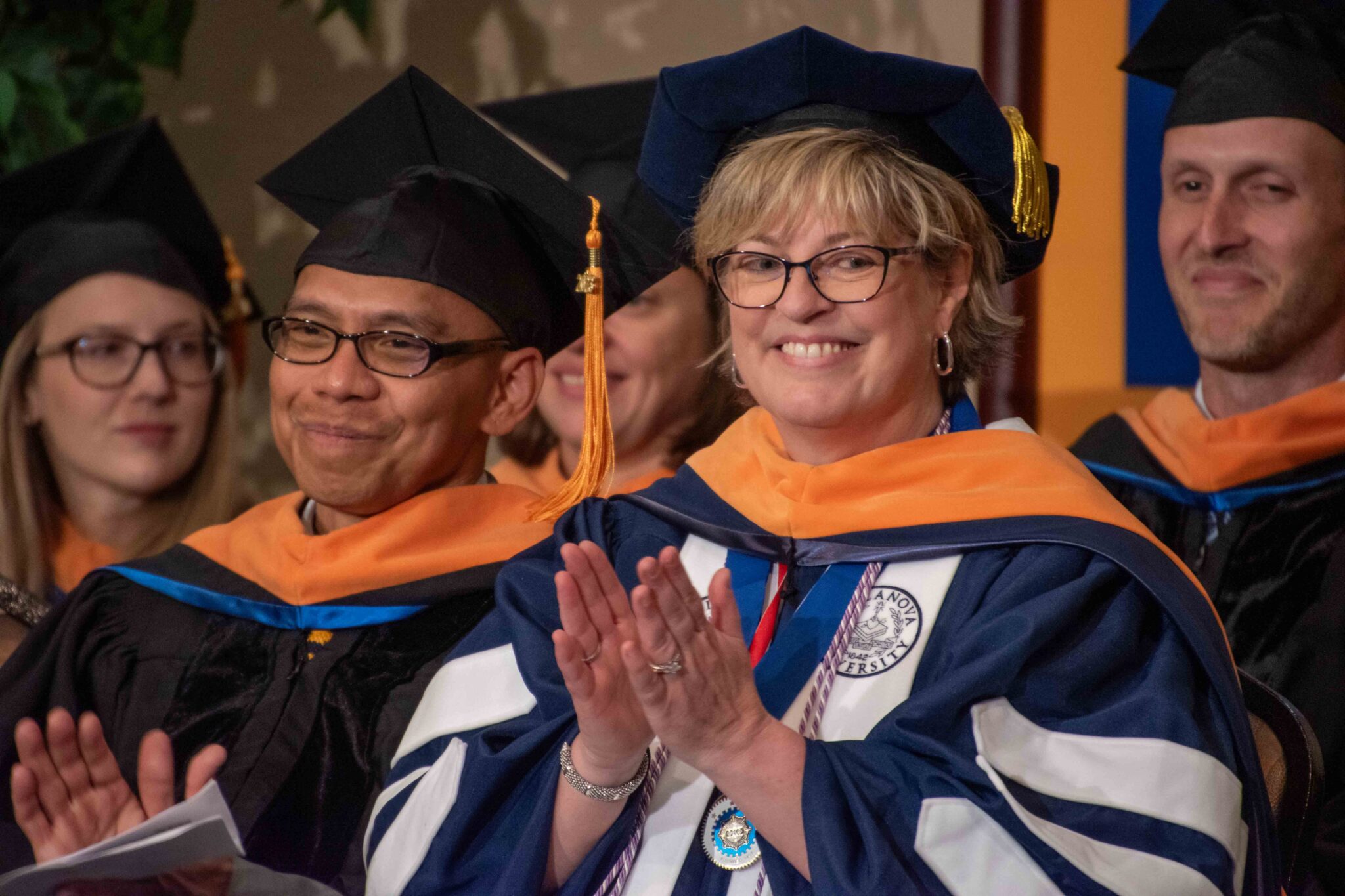 Dr. Jay Tumulak (left) and Dr. Lisa Thiemann (center) at the 2023 Doctor of Nursing Practice in Anesthesiology graduation ceremony