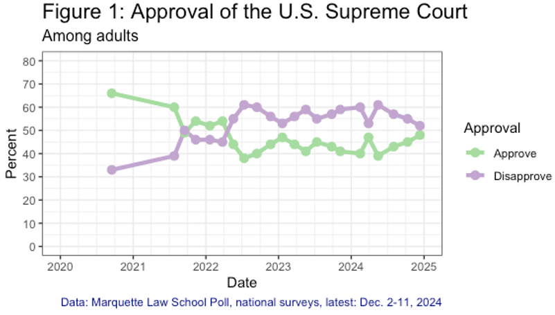 MILWAUKEE – A new Marquette Law School Poll national survey finds that 48% of adults approve of the job the U.S. Supreme Court is doing, while 52% disapprove. In October, approval was 45% and disapproval was 55%. This is the highest Court approval since March 2022, when 54% approved.