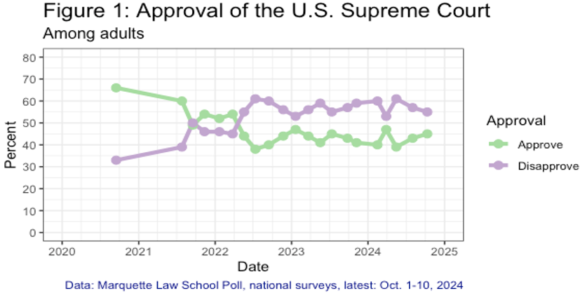 MILWAUKEE – A new Marquette Law School Poll national survey finds that 45% of adults approve of the job the U.S. Supreme Court is doing, while 55% disapprove. In July, approval was 43% and disapproval was 57%.