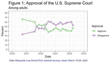 MILWAUKEE – A new Marquette Law School Poll national survey finds that 47% of adults approve of the job the U.S. Supreme Court is doing, while 53% disapprove. This is the highest approval of the Court since January 2023, when it was also 47% with 53% disapproving. The last time approval was greater than 50% was March 2022, when it was 54%.