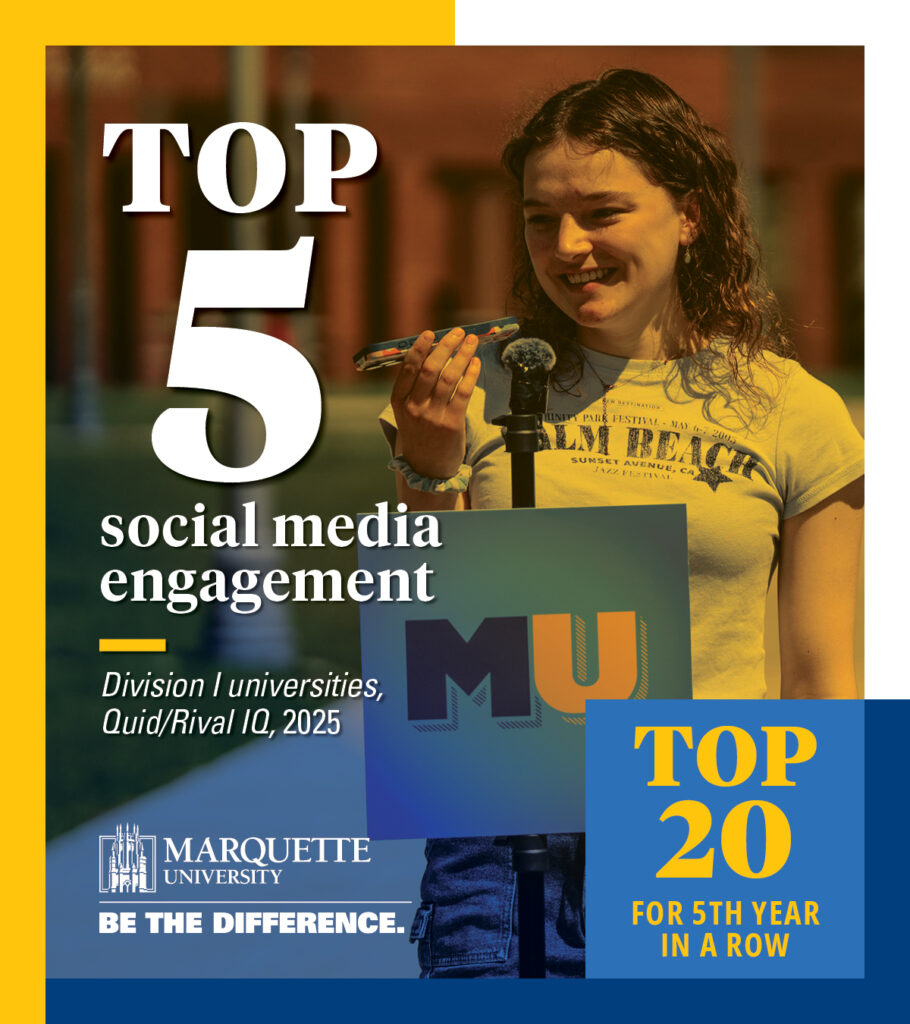 “Marquette is easily the smallest university by enrollment in the top 10, so to see the engagement we secure across all platforms is a testament to the creativity and commitment of our social media strategy and execution,” said Enrique Torruco, associate director of social media. “To outperform our peers, as well as state flagship institutions with four to five times our student population, is a tremendous achievement that is shared across our team, including Emily Reyes, our digital content specialist, and a creative group of social media interns.”