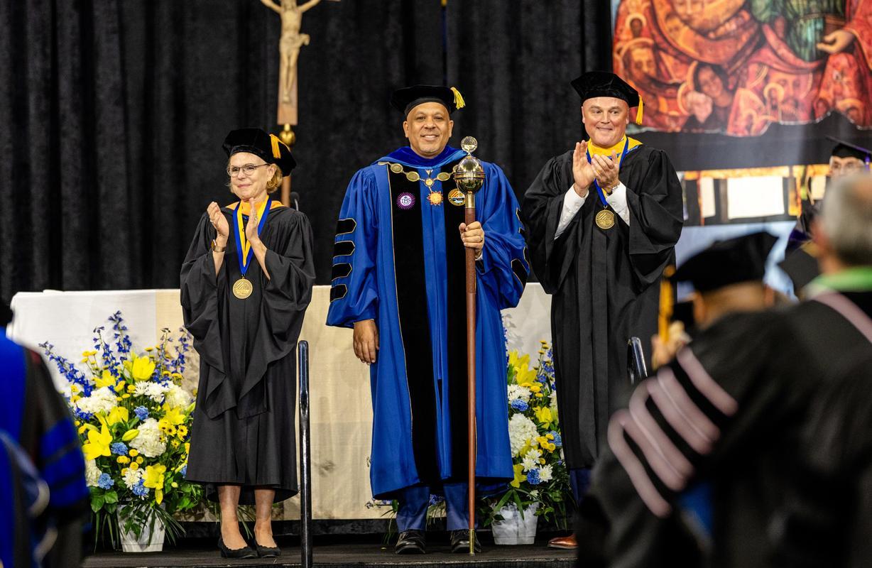 Todd Adams, chair of the Marquette University Board of Trustees, and Peggy Troy, trustee emerita, installed President Ah Yun on behalf of the Board of Trustees, while Rev. James Prehn, S.J., socius of the Midwest Jesuit Province, oversaw the commissioning.