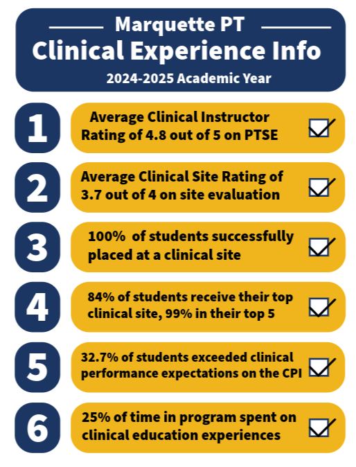 Thank you for your interest in Marquette University's Department of Physical Therapy Clinical Education Program. We are proud to offer 32 weeks of high-quality, hands-on clinical education experiences to our Doctor of Physical Therapy students.